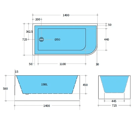 Left Corner Bathtub Matte/Gloss White Casey Back to Wall 1400mm