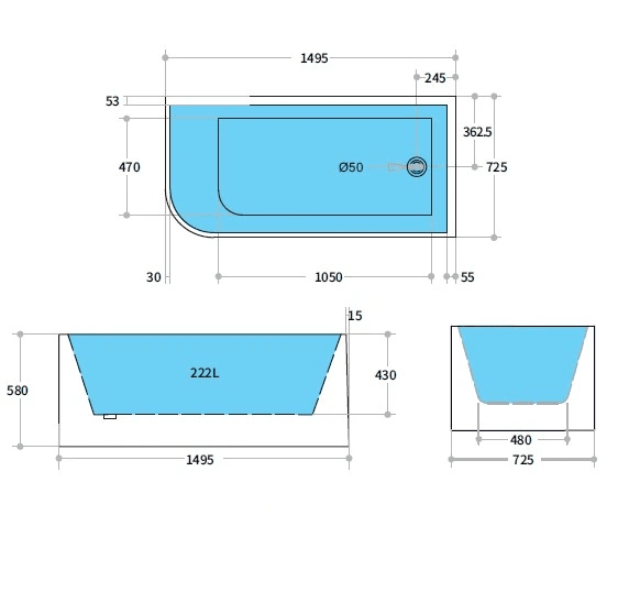 Right Corner Bathtub Matte/Gloss White Casey Back to Wall 1500mm
