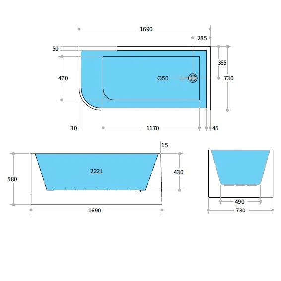 Right Corner Bathtub Matte/Gloss White Casey Back to Wall 1700mm