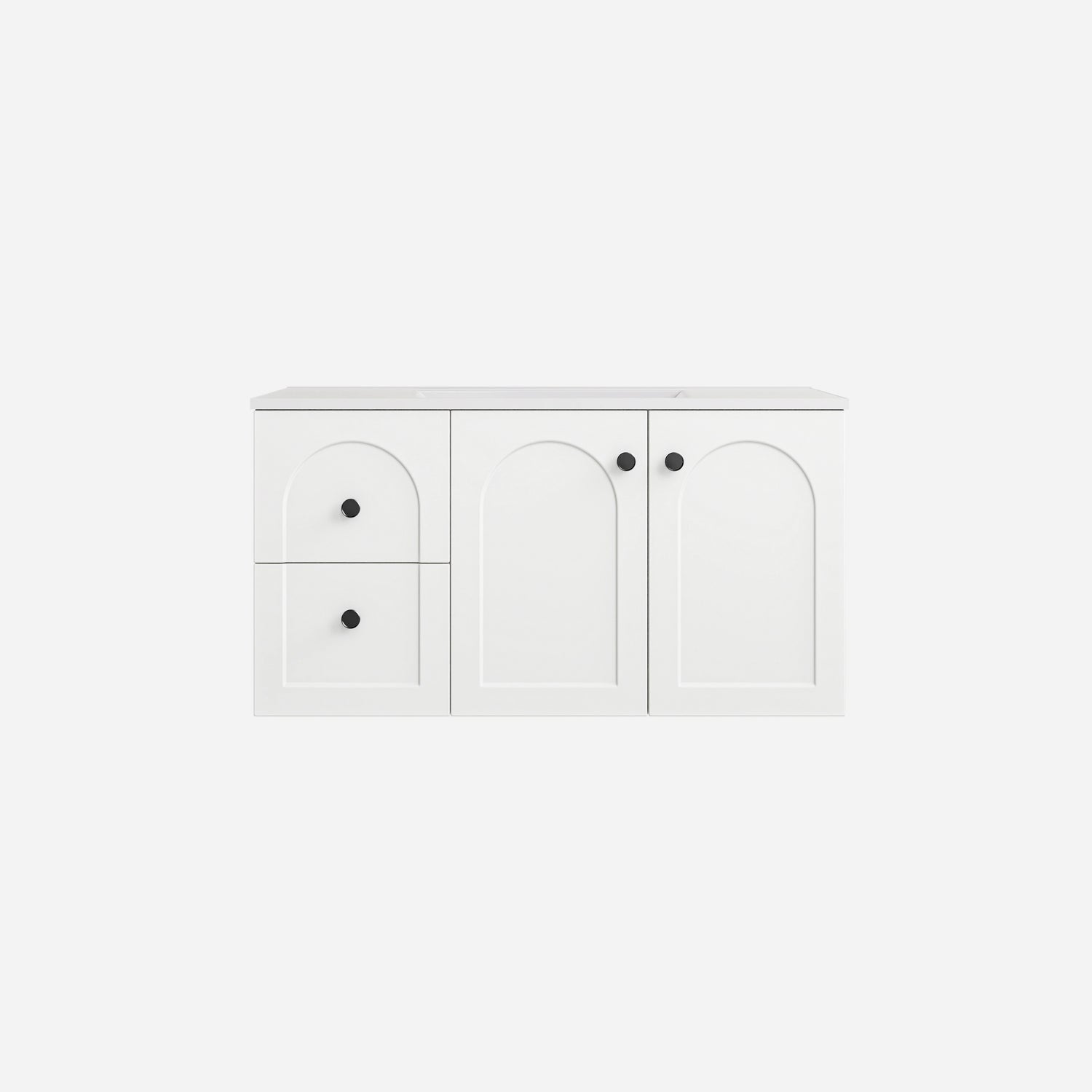 Chester Archie Hampton 900mm Matte White PVC Waterproof Wall Hung Bathroom Vanity Brushed Nickel Handles - Cabinet only / Matte White / Drawers on Left (Black Handles) is backordered and will ship as soon as it is back in stock.