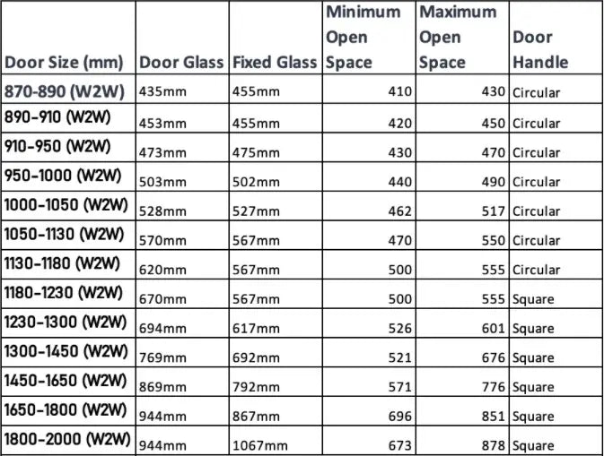 - 870-1180 have a small round door handle to maximise opening space