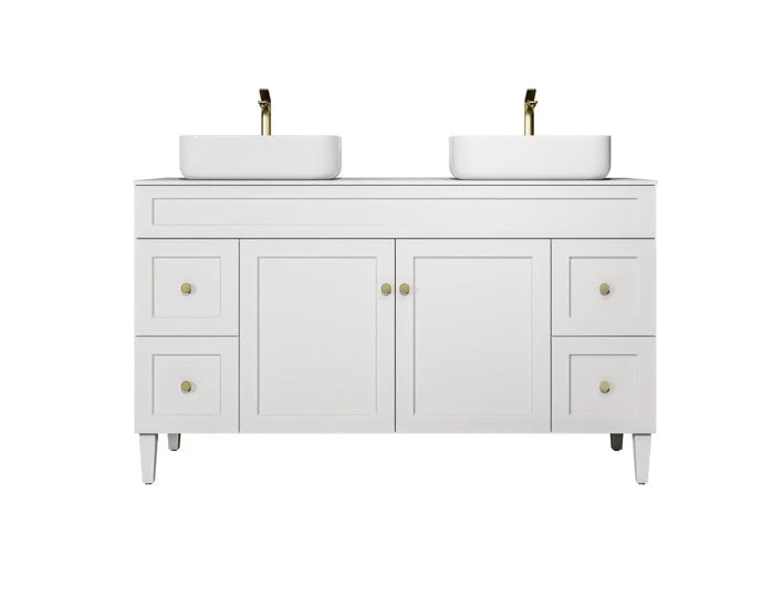 Harrington Hampton Shaker 1500mm Matte White Double Bowl PVC Waterproof Freestanding Vanity Carrara Stone Top
