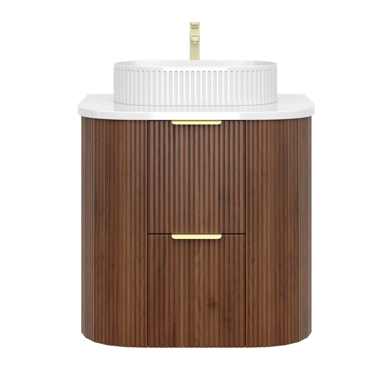 Timber Walnut Artis 600mm Fluted Curved Waterproof Wall Hung Vanity Carrara Gold Stone top - Cabinet only / Chrome / Walnut is backordered and will ship as soon as it is back in stock.